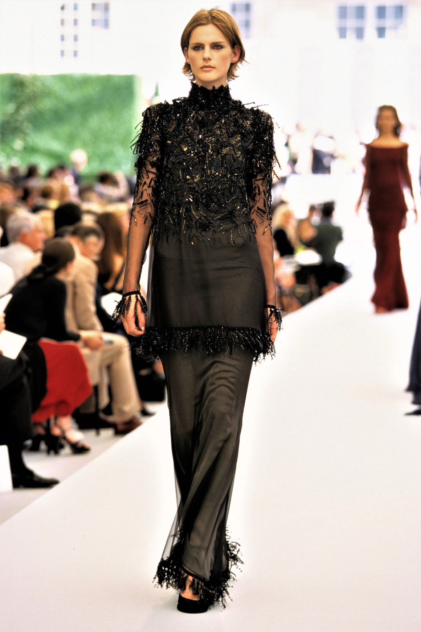 The first for the rehearsal dinner was a recreation of a look Stella Tennant originally wore during Chanel fashion show 1997 (it was black).