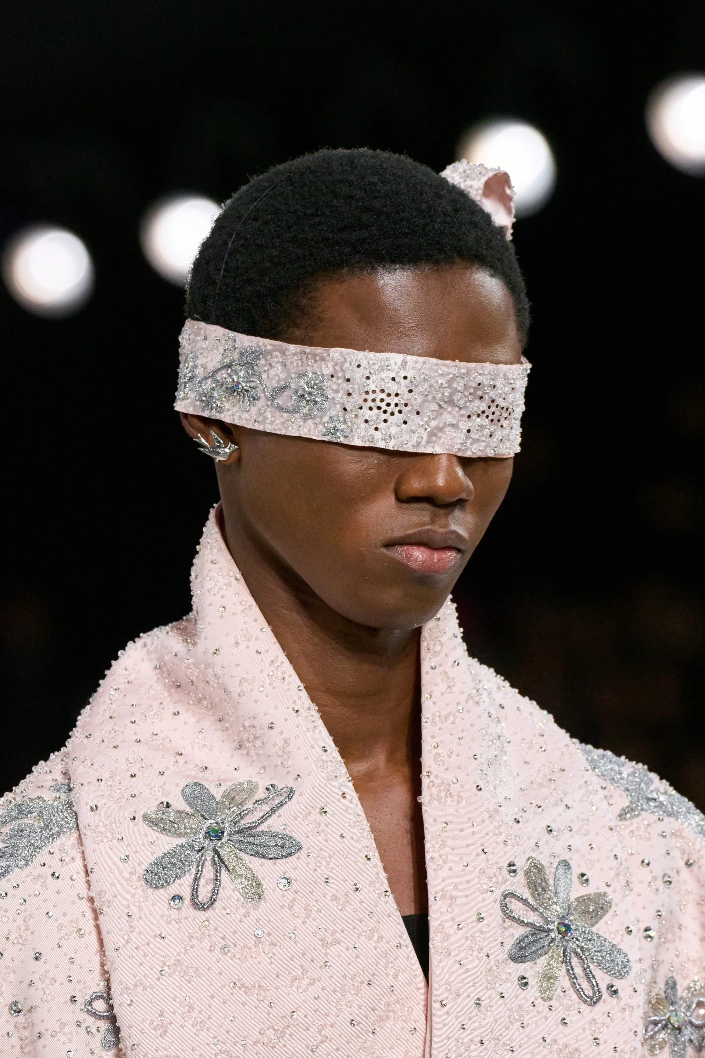 Let's start with a couture detail I saw at the Dior by Kim Jones show: the satin ribbon masks with a side bow (you know, the bow Monsieur Dior loved so much), with eyeholes so you can actually see. Some had the Dior logo in organza, while others were embellished with meticulously sewn glass beads.