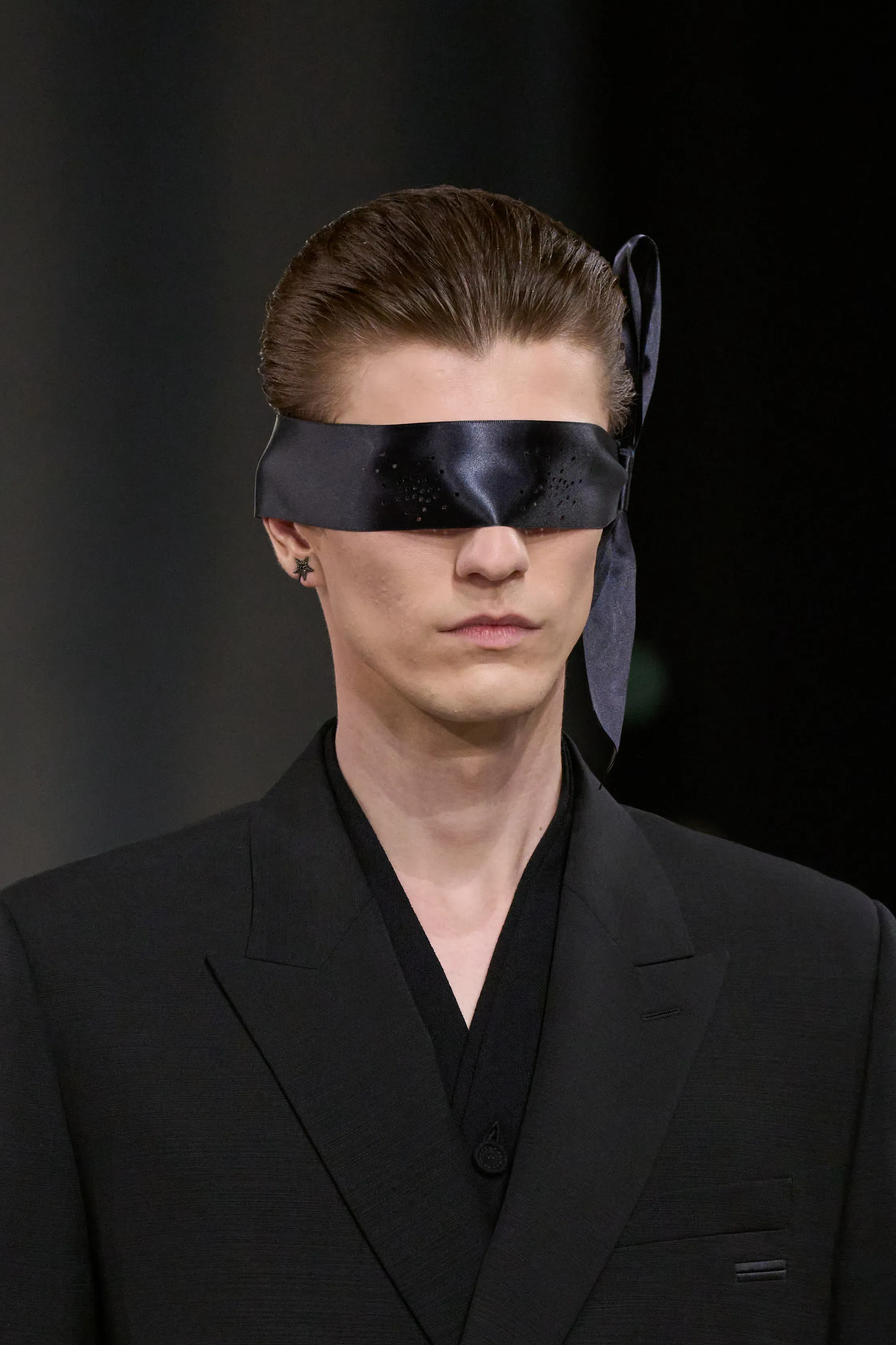 This is the kind of masterful creativity that Stephen Jones Millinery is known for. He's managed to make the bow feel totally fresh and aerodynamic. As soon as I saw that first model in black with the mask, I thought: this is what happens when menswear meets couture.
