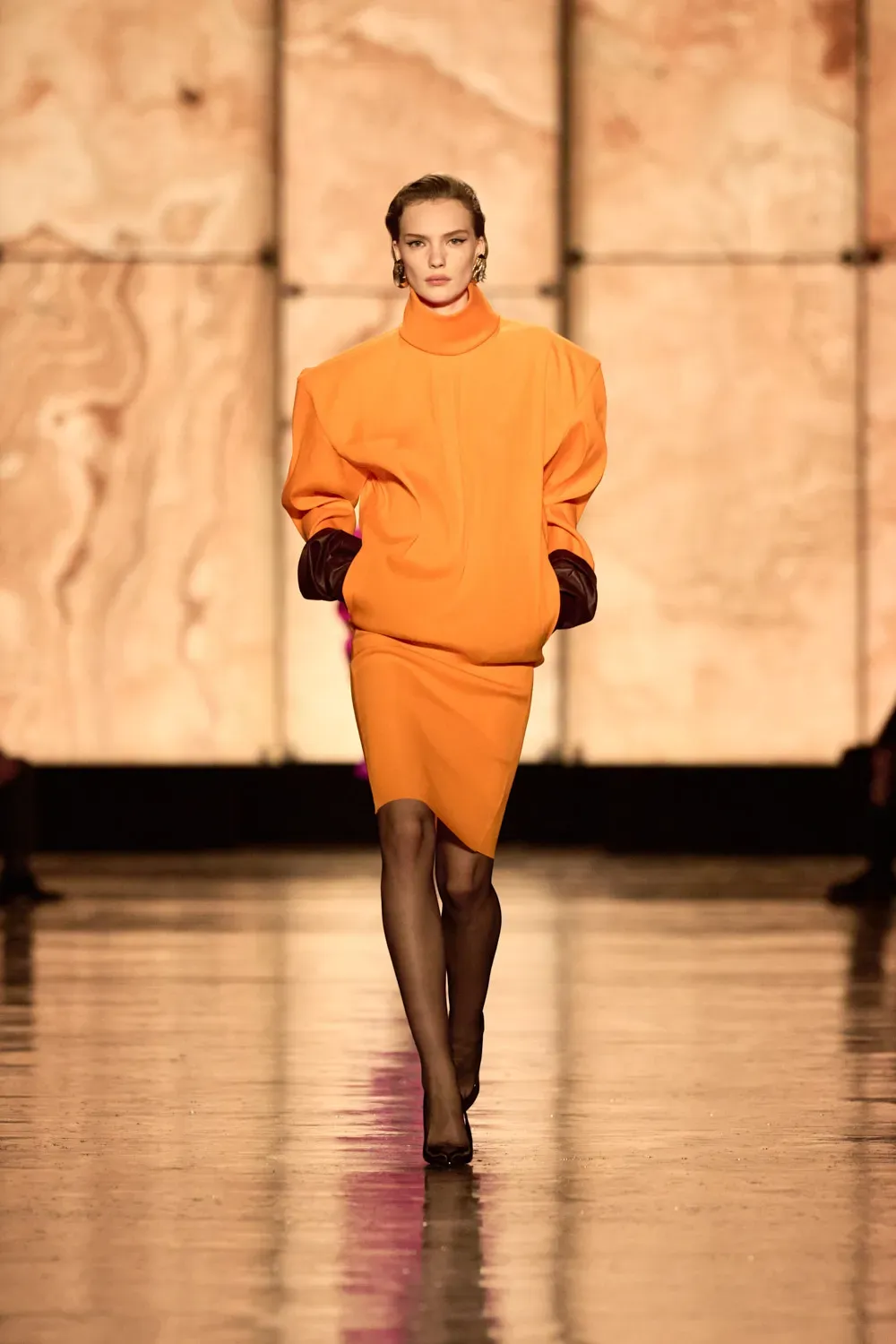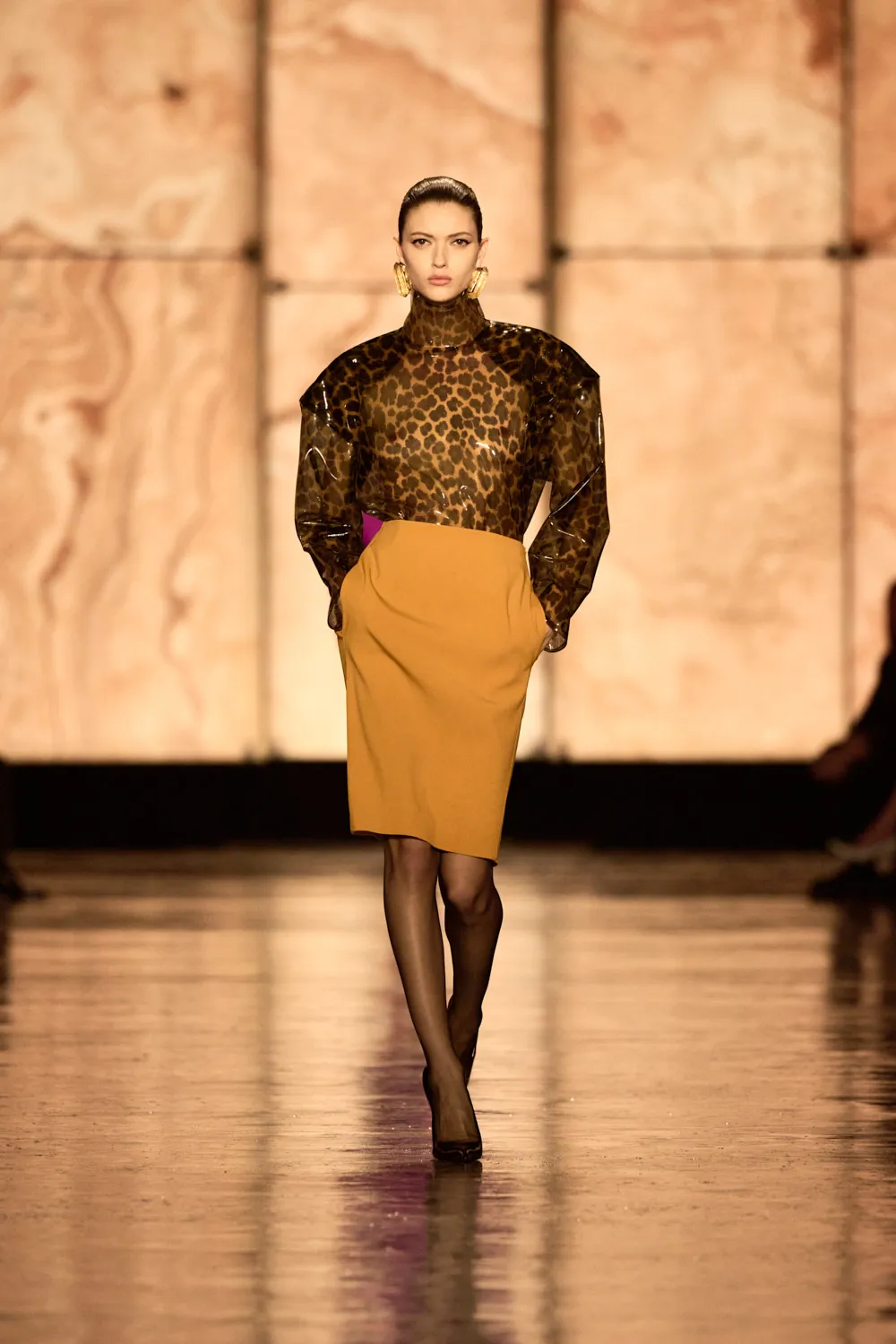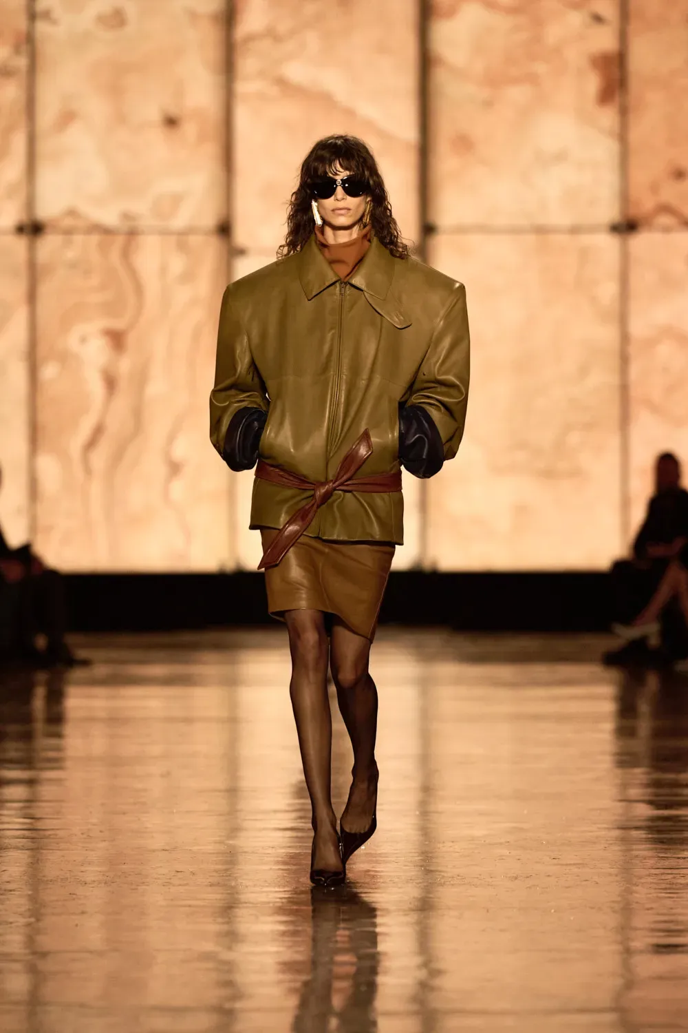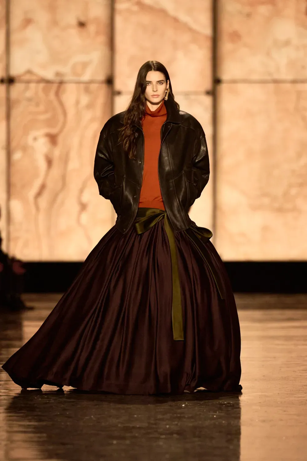On the runway, an architecture of clean lines and carefully calibrated volumes defined an intense, confident femininity—never shouted, always deliberate. Vaccarello orchestrated an essential wardrobe, playing with proportions and whispered sensuality. Black dominated the scene, accompanied by deep shades of forest green, burgundy, and anthracite gray, while the fabrics told a story of quiet luxury: compact wool, opulent velvet, and silk-smooth leather.