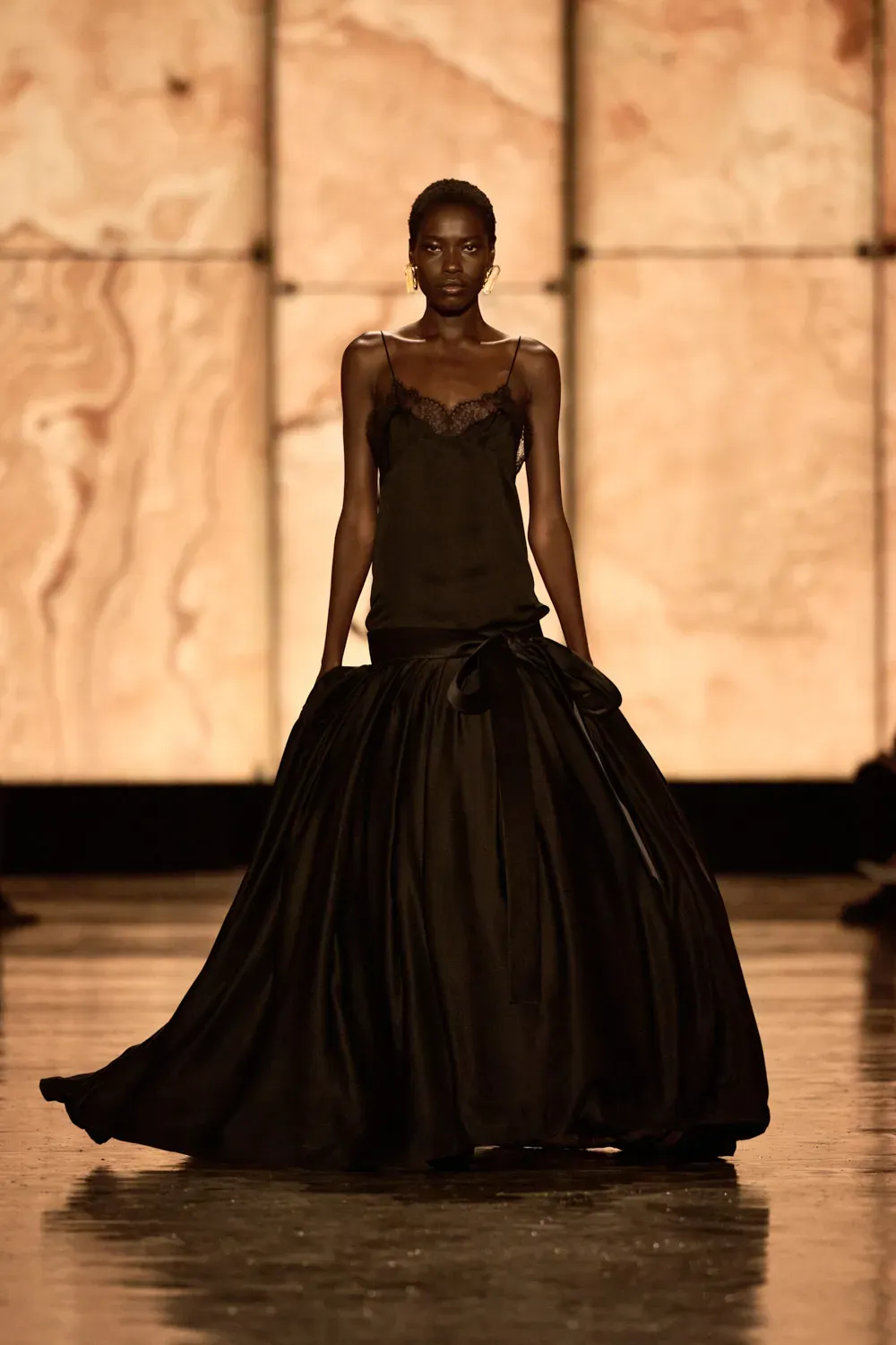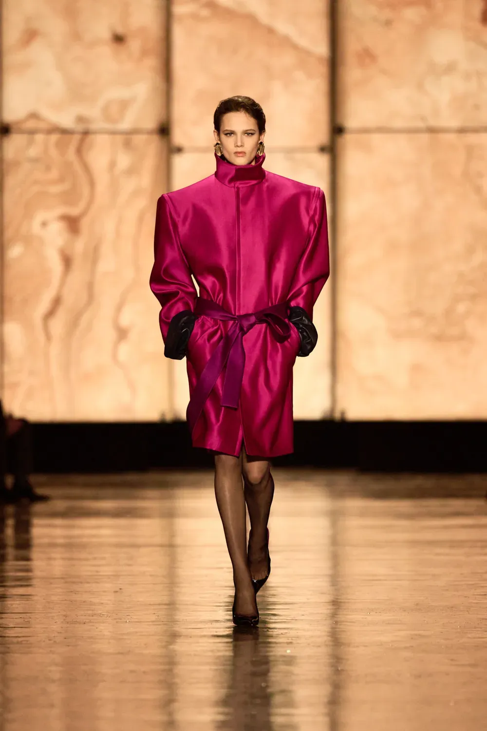 Saint Laurent’s heritage was present in every detail: from lavallière collars reinterpreted in a minimalist key to dramatic trench coats brushing the ankles, to sleek boots that accompanied each step with millimeter precision. Nothing was left to chance, nothing was superfluous.
