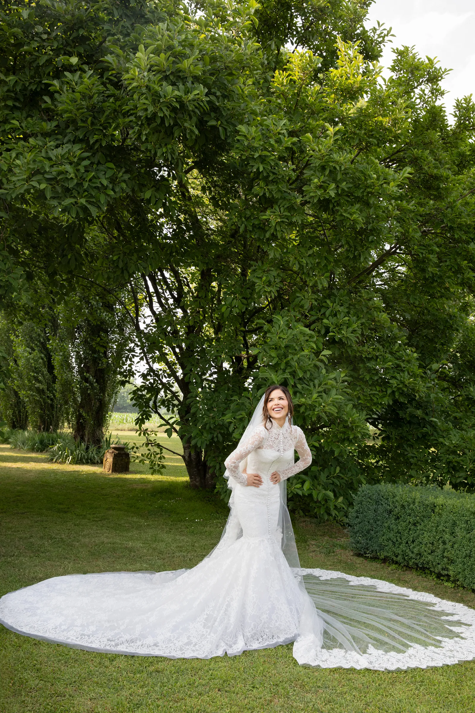 Lauren Sánchez wore a custom Dolce & Gabbana gown that immediately entered the bridal fashion hall of fame. It was a true masterpiece: a corseted mermaid silhouette, crafted in delicate lace with transparent long sleeves, a high neckline, and a dramatic train. The look was finished with 180 hand-covered chiffon buttons, each a testament to the kind of artisanal precision only Dolce & Gabbana can deliver.