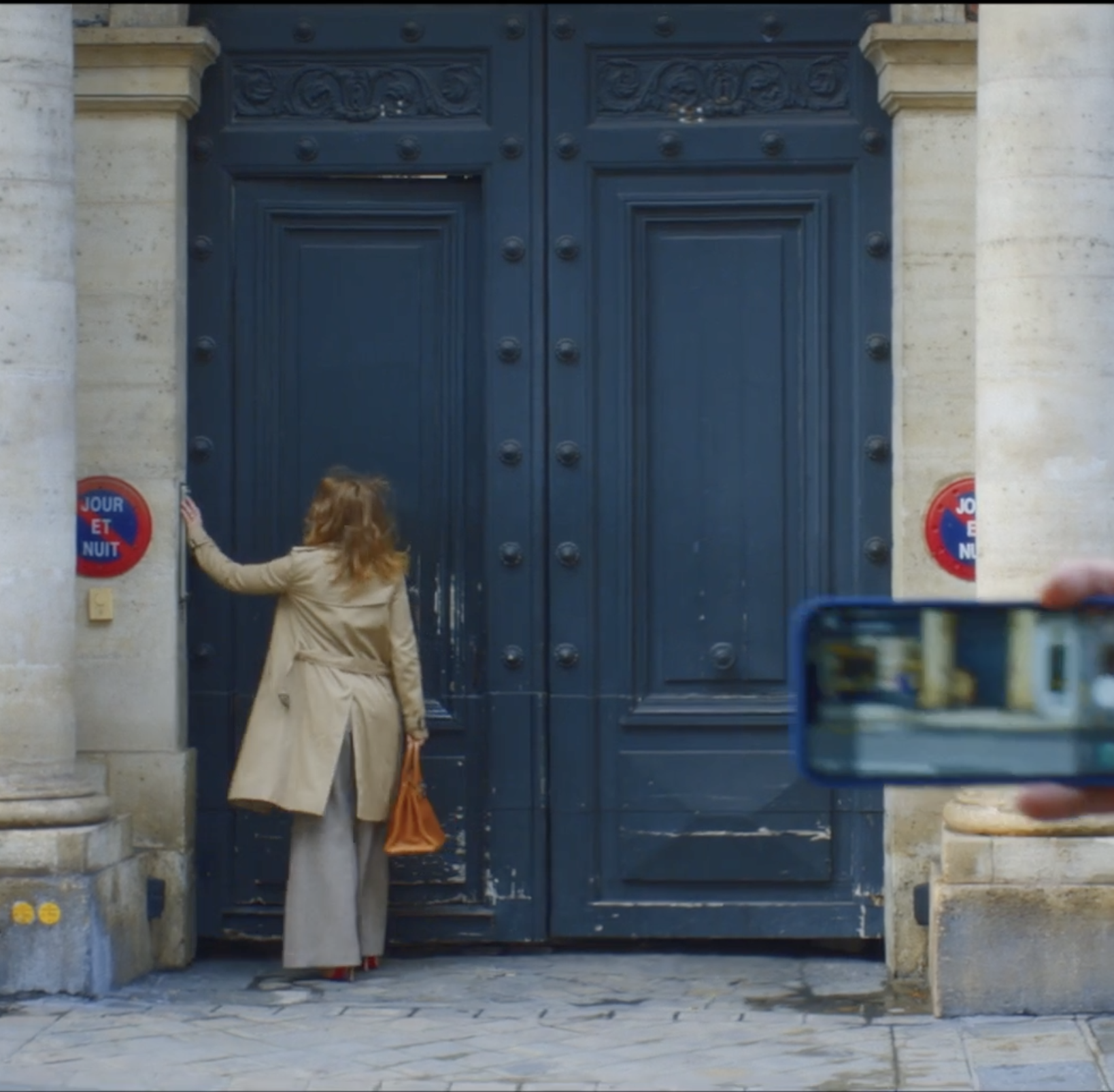 As I was saying, I love her style from the very first shots: a white turtleneck with a navy, sailor-style jacket with gold buttons, a ponytail, and a camel–orange Birkin bag that she often carries while walking through the Parisian rues (or my rues…). Or a classic trench coat with jeans, a single-button blazer with jeans and a Hermès Della Cavalleria Mini II shoulder bag (which I love so much), and then, of course, the Cartier Tank watch, always worn with great class and unmistakable Parisian charm.